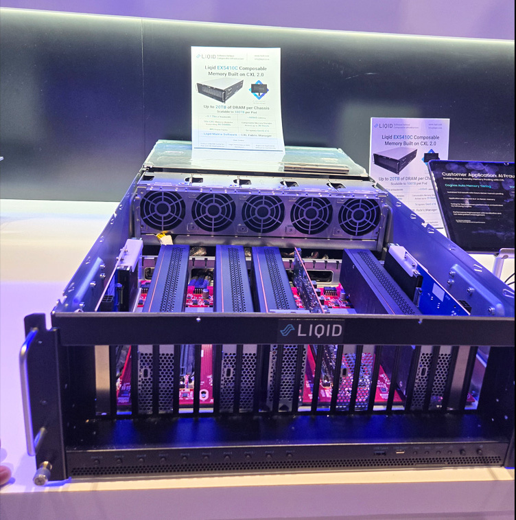 The Liqid EX5410C is a demonstration of a CXL memory pooling and sharing appliance capable of scaling up to 20TB of additional memory. Five of the 4RU appliances can then be integrated into a pod for a whopping 100TB of memory and 5.1Tbps of additional memory bandwidth. The CXL fabric is managed by Liqid’s Matrix software that enables real-time and precise memory deployment based on workload requirements: