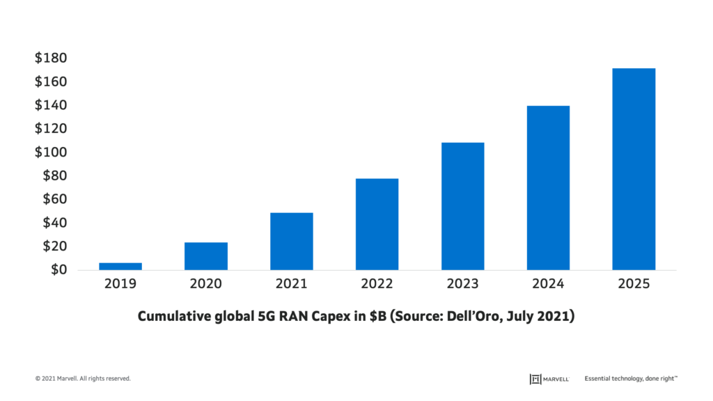 Figure 1: Cumulative Global 5G RAN Capex in $B (source: Dell’Oro, July 2021)