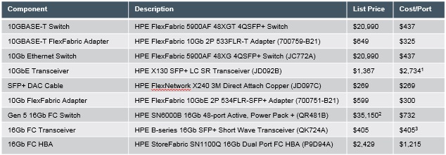 Now that we have that out of the way, let’s start by looking at the cost difference between iSCSI and FC. We have to take into account the costs of the adapters, optics/cables and switch infrastructure. Here’s the list of Hewlett Packard Enterprise (HPE) components I will use in the analysis. All prices are based on published HPE list prices.