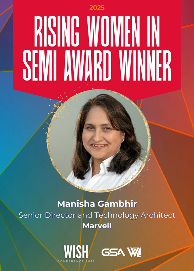 Manisha Gambhir, senior director and technology architect at Marvell, was honored with the 2025 Rising Women in Semi award at the Global Semiconductor Alliance (GSA) Women in Semiconductor Hardware (WISH) conference.