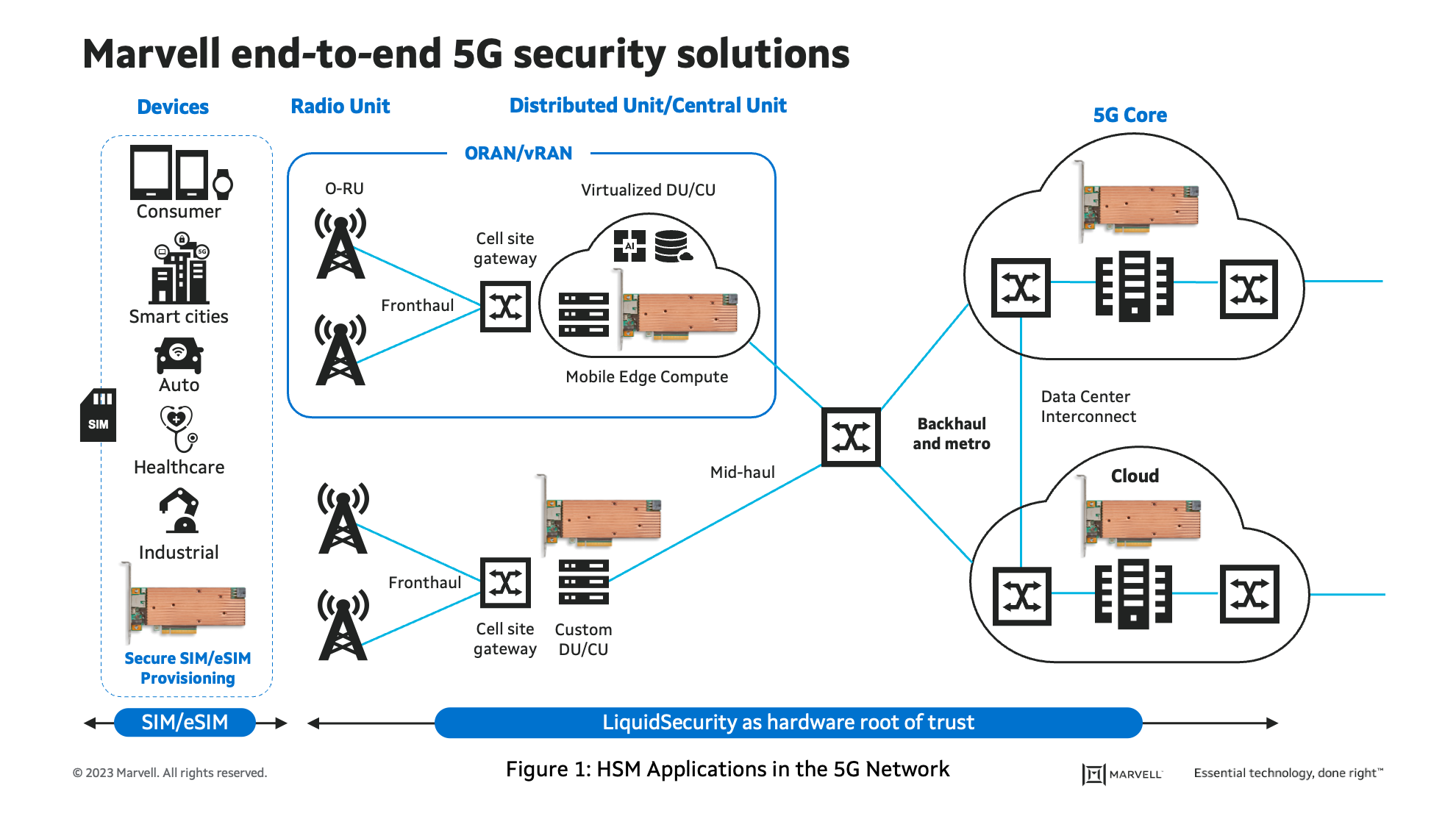 Marvell’s LiquidSecurity HSMs are already deployed at the top five CSPs to offer HSM services in the cloud for thousands of customers globally. Our recently announced LiquidSecurity 2 HSM provides unparalleled performance, crypto agility (support for the latest PQC algorithms), and cloud optimized features. It can be deployed on-prem or offered as a service in the cloud within the edge compute CU or backend core network. All five use cases discussed in this blog can make use of Marvell HSMs to secure the encrypted 5G datasphere from edge to core.