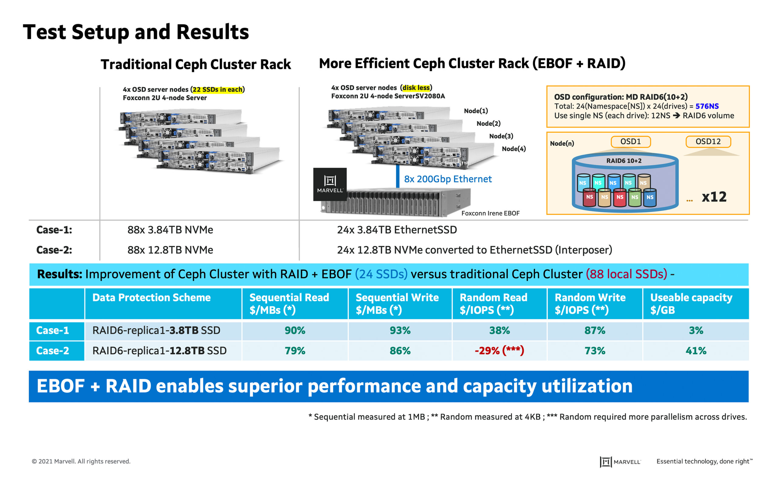 The traditional Ceph cluster four OSD server node incorporated 88 (total) local SSDs on four servers.The results clearly indicate that the Ceph cluster with EBOF is significantly cost optimized compared to the traditional Ceph cluster. Ingrasys is running latency benchmarks for comparison. Please stay tuned for more data. Marvell is proud to have collaborated with Ingrasys on this Ceph cluster exercise and demonstrate the value of the Ethernet Bunch of Flash (EBOF) solution in contributing to lower total cost of ownership in the data center.