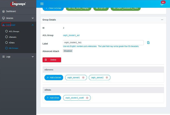 Ingrasys CDI Director provides an intuitive WebUI to configure EBOF drives for Ceph cluster. EBOF volumes consist of multiple NVMe-oF drives. Drives will be configured to the RAID device on the server node. It supports non-RAID and RAID0/1/4/5/6/10 configurations. It is recommended to configure OSD to RAID 5/6 to prevent an NVMe drive failure case. Storage servers and volumes can join to the HA Group. Every volume or server belongs to one high availability (HA) group; volumes can then migrate to one of the HA group servers if the connected server has crashed. Ceph OSD drives can be a failover between the Ceph OSD server within the HA Group. Ceph OSD will be connected to all servers in this HA group in advance. Each OSD process can only be activated in one server.