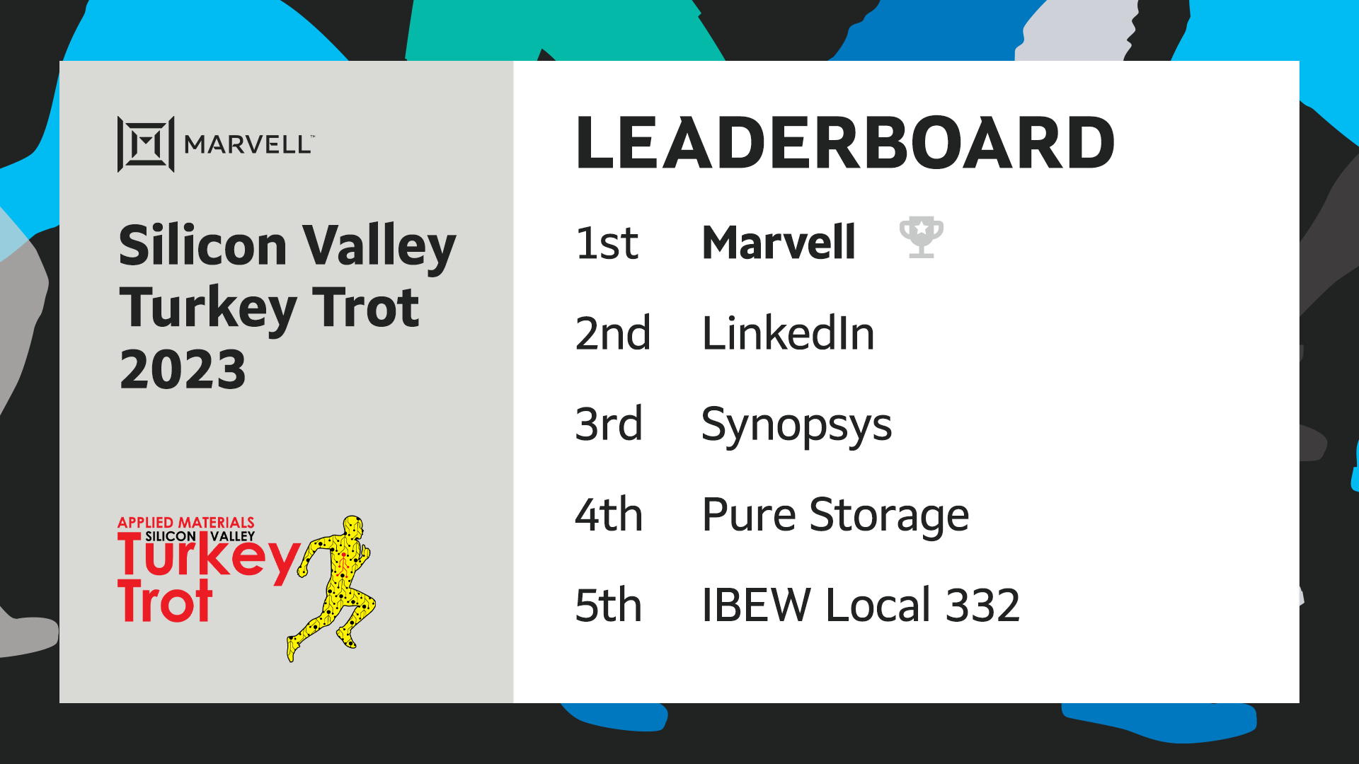 "The Silicon Valley Turkey Trot is a fantastic opportunity to make a positive impact on our local community by supporting charitable organizations committed to improving the quality of life for those overcoming challenges in Silicon Valley,” said Janice Hall, EVP and Chief Human Resources Officer, at Marvell. “At Marvell, we place a strong emphasis on employee health and well being, and we’re proud to win the ‘Fittest Firm’ competition for the eighth year in a row.”