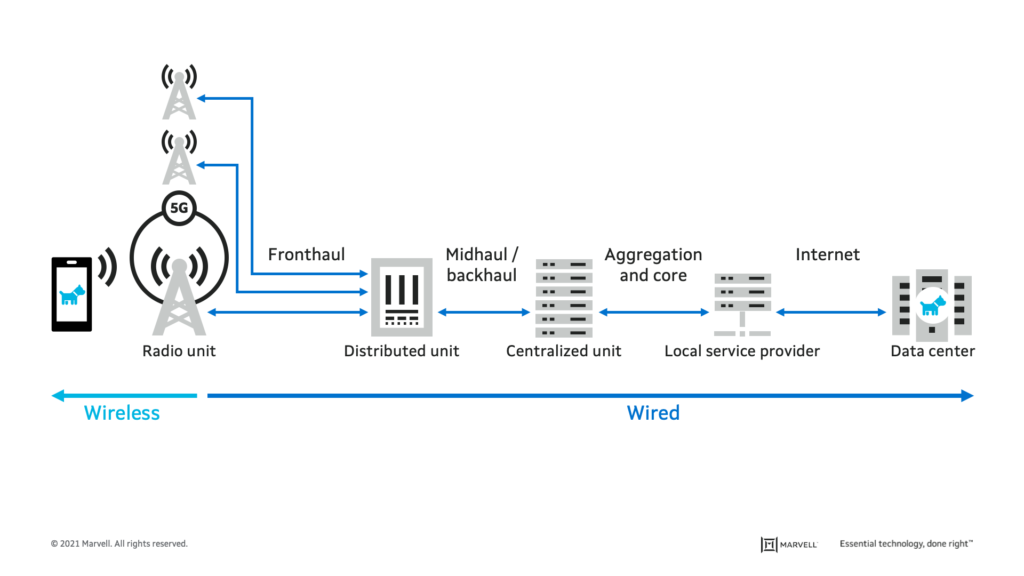 Wired data movement like this, at scale, is at the heart of the technologies developed by Inphi, an opto-electronics pioneer acquired by Marvell in April 2021. The analogy that Ford Tamer, Marvell Board Member and former Inphi CEO, liked to draw is that Marvell’s optical business is the “Fedex of Data.” 5G network transport is just one example where there is an unmet need in providing cost-effective low power solutions to move the huge amounts of data being generated around the world. Marvell optical interconnect solutions address that need by reliably moving data at up to 100’s gigabits per second over distances of a few meters to thousands of kilometers.