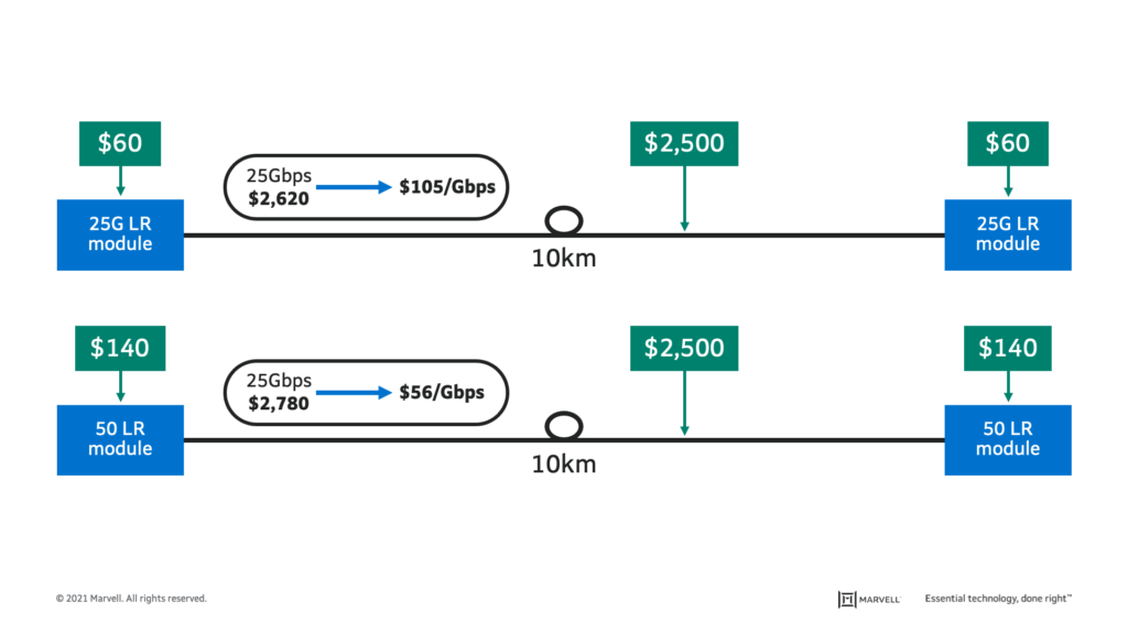 As a benefit of widespread market acceptance, PAM4 technologies are now enjoying economic advantages of scale as well. As port counts go into the millions, the cost per Gbps of PAM4 based optical x-haul dramatically decreases compared to lower data rate technologies. For example, according to LightCounting the price of a 25 Gbps x-haul module for a 10km link is $60. Additionally, LightCounting projects a 50 Gbps Long Reach x-haul module at an ASP of $140. When accounting for the cost of fiber at a market price $0.25 / meter, the PAM4 50 Gbps link provides about a 50% reduction in cost per gigabit per second as shown in figure 5.