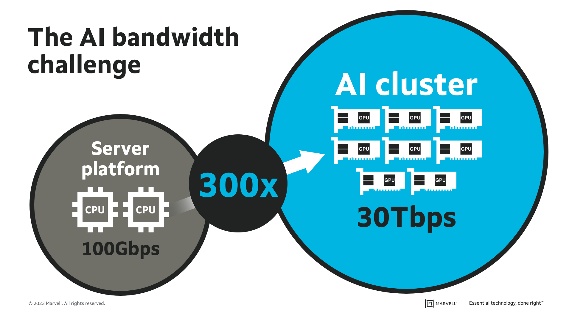 Having established the distinctive architecture of AI platforms compared to traditional compute platforms, it is also important to note AI platforms’ massive bandwidth requirements. For instance, each xPU or AI accelerator used in the example AI platform has 3.6Tbps of networking bandwidth resulting in a total bandwidth of nearly 30Tbps per server. In comparison, today’s typical cloud compute server has an average networking bandwidth of 100Gbps. This represents a 300X multiple of bandwidth capacity as compared to today’s typical cloud compute server.