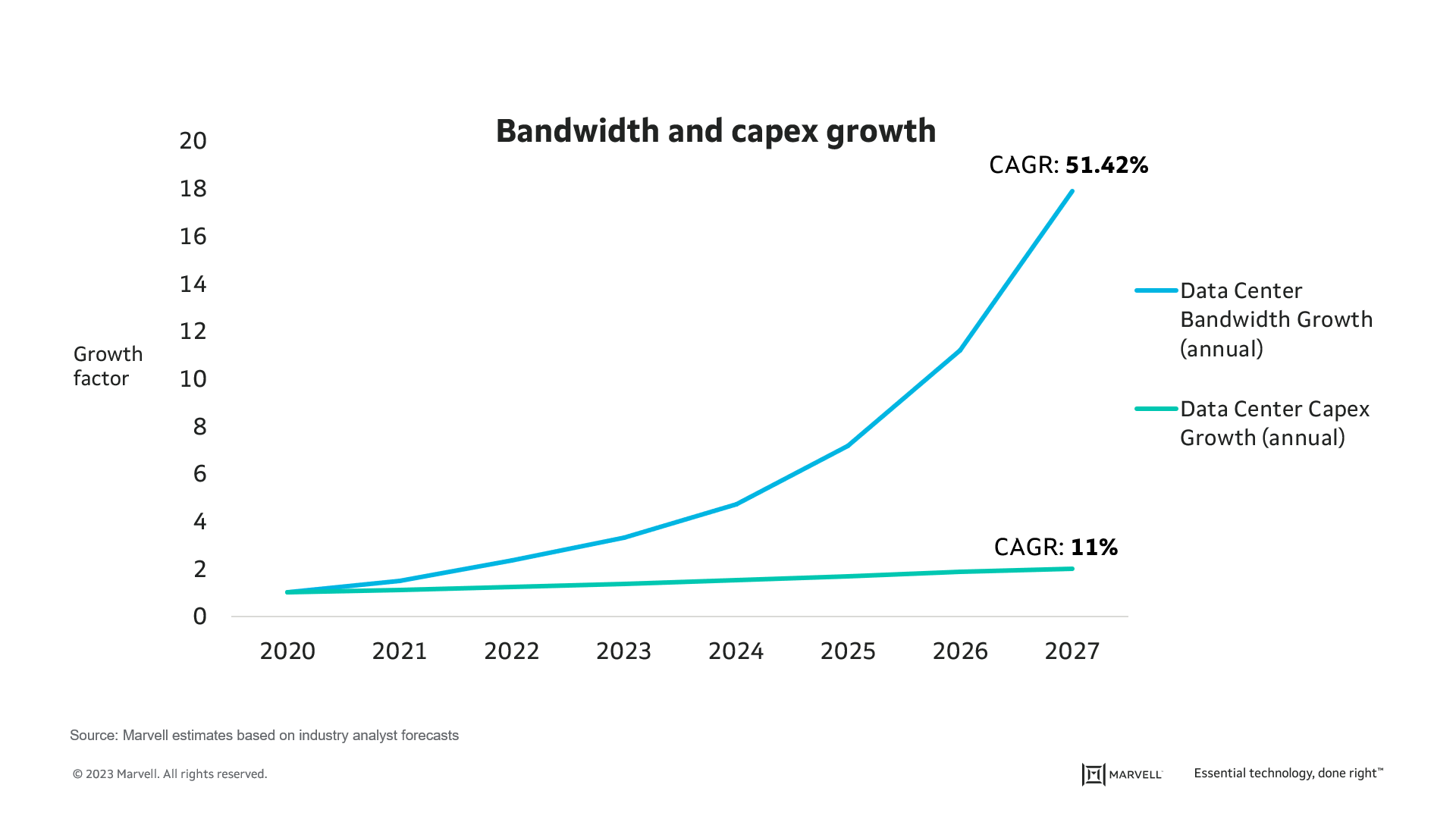 But this data center popularity is also a problem. As shown by the blue line below, analysts expect data center bandwidth to grow at more than 50% CAGR over the next five years. But look at the green line. CAPEX is slated to grow by only 11%, meaning that data center operators will have to squeeze far more work out of their facilities than ever before. If they can, we will see continued adoption of new technologies such as ChatGPT and wider adoption of initiatives such as medical health records. If not, costs will rise, and progress will slow.