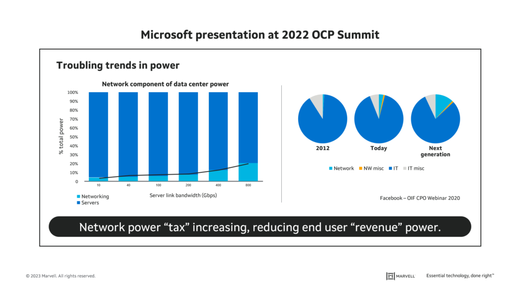If we peer inside the walls of the data center, we can see that power consumption associated with networking is increasing its share of overall data center electricity usage, as presented by Microsoft at OCP 2022.