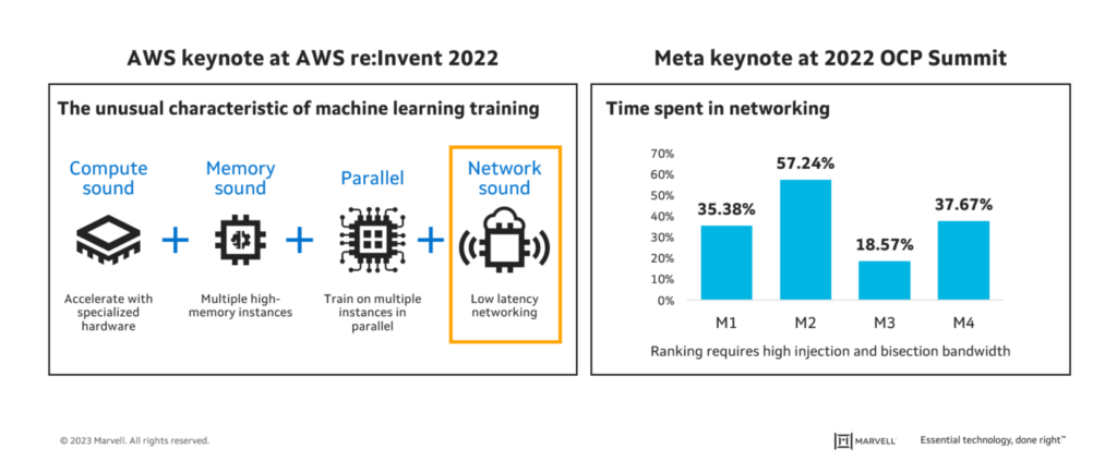 At the OCP Summit in October 2022, Meta speaker Alexis Bjorlin highlighted the surprising percentage of time spent in networking for AI training workloads. In December 2022 at AWS re-Invent, Peter DeSantis specifically identified the network as an ML-training constraint. As both speakers show, the need is clear: lower latency networking.